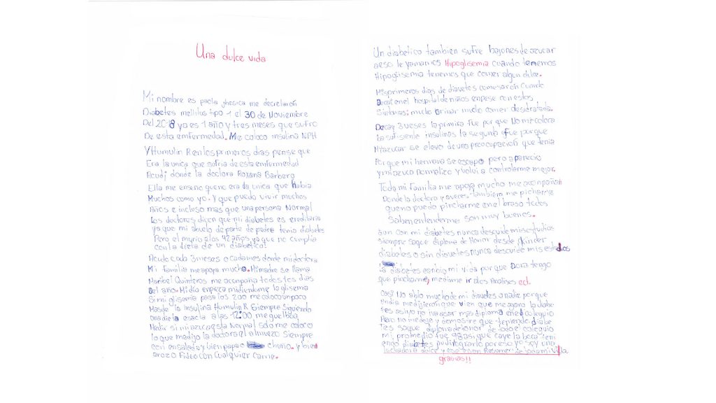 My name is Paola Yesica. I was diagnosed with Type 1 diabetes mellitus on November 30, 2018. It has already been a year and three months since I started suffering from this disease. I take NPH insulin and Humulin R. In the early days, I thought I was the only one suffering from this disease. I went to Dr. Roxana Barbero. She taught me that I was not the only one, and that there were many like me. And that I can live many years and even longer than a normal person.