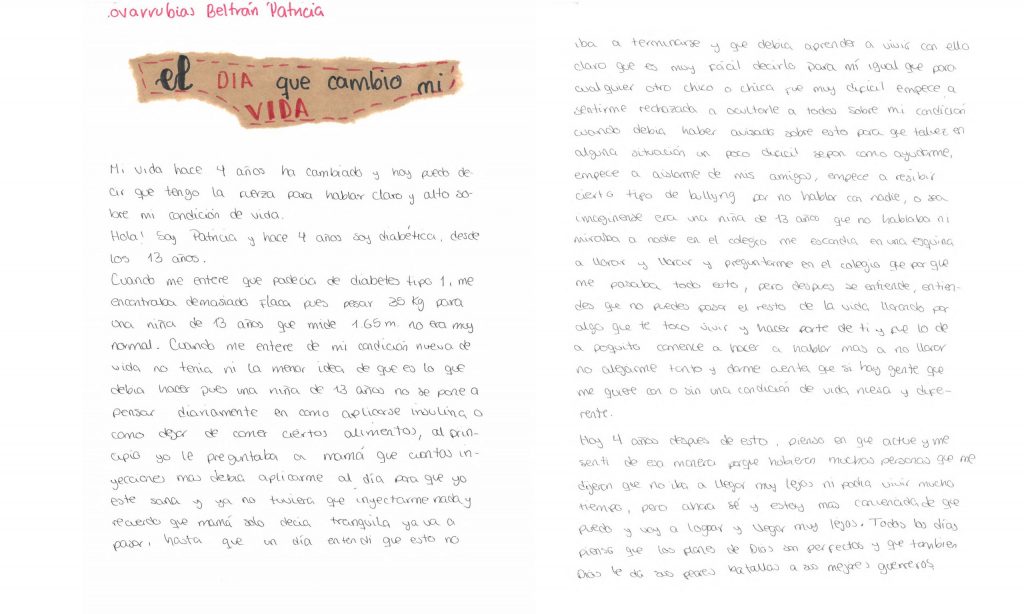 When I found out that I had Type 1 diabetes, I was too skinny because 77 pounds is not a normal weight for a 13-year-old girl who is 5 ft 5”. When I found out about my new life condition, I had no idea what to do because it is not a normal thing for a 13-year-old girl to just start thinking daily about how to take insulin or how to stop eating certain foods. At first, I asked my mother how many more injections I should give myself per day so that I could be healthy and no longer have to inject anything, and I remember that my mother only said: calm down, it will pass. Until one day I understood that this was not going to end and that I had to learn to live with it. Of course, it is easier said than done, for me as well as for any other boy or girl, it was very difficult. I began to feel rejected, to hide my condition from everyone when I should have warned them about it so that, perhaps in some difficult situation, they would know how to help me. I began to isolate myself from my friends, I began to receive a certain type of bullying for not talking to anybody. I mean, imagine, I was a 13-year-old girl who did not speak or look at anyone. At school I would hide in a corner to cry and cry and ask myself why all this happened to me, but then you understand that you cannot spend the rest of your life crying over something that you have to go through and that will be part of yourself. And I began to change gradually, to speak more, to stop crying, to not distance myself so much, and to realize that there are people who love me with or without a new and different life condition.
