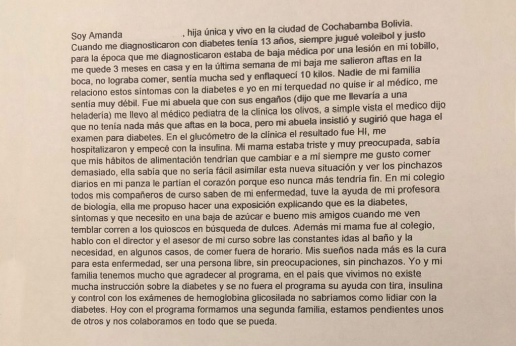 I am Amanda Laura Castelu, an only child, and I live in the city of Cochabamba, Bolivia. I was 13 years old when I was diagnosed with diabetes. I have always played volleyball and just by the time I was diagnosed I was on medical leave due to an ankle injury. I stayed home for 3 months, and in the last week of my leave I got mouth sores, I could not eat, I felt very thirsty, and I lost 22 pounds. Nobody in my family related these symptoms to diabetes, and I was stubborn and did not want to go to the doctor, I felt very weak. It was my grandmother who, with her tricks (she said she would take me to an ice cream parlor), took me to the pediatrician at the Los Olivos clinic. At first glance the doctor said I had nothing but mouth sores, but my grandmother insisted and suggested I get tested for diabetes. In the clinic’s glucometer the result was High, they hospitalized me, and I started taking insulin. My mother was sad and very worried, she knew that my eating habits would have to change, and I always liked to eat too much. She knew that it would not be easy to assimilate this new situation and seeing the daily punctures in my belly broke her heart because she knew that it would never end. At school, all my classmates know about my illness. I had the help of my biology teacher. She proposed that I make a presentation explaining what diabetes is, the symptoms, and what I need when I have low blood sugar and, well, when my friends see me shaking, they run to the kiosks to get candy for me. Also, my mom went to school, spoke with the principal and my course advisor about the constant trips to the bathroom and in some cases, the need to eat out of schedule. My dreams are nothing more than to have a cure for this disease, to be a free person, without worries, without punctures. My family and I have a lot to thank the program. In the country we live in, there is not much diabetes education and if it were not for the program and their help with strips, insulin, and management with glycosylated hemoglobin tests, we would not know how to deal with diabetes. Today, with the program we have a second family, we look after each other, and we collaborate in everything we can.