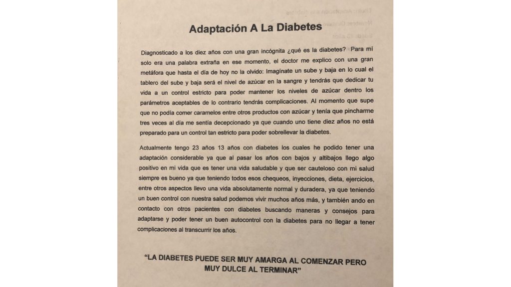 I am currently 23 years old, and I have lived with diabetes for 13 years, during which I have been able to adapt considerably since, as the years go by with ups and downs, something positive came into my life, which is to have a healthy life and that being cautious with my health is always good. Since having all those check-ups, injections, diet, exercises, among other aspects, I lead an absolutely normal and long-lasting life, because having a good health management we can live many more years, and I am also in contact with other patients with diabetes looking for ways and advice to adapt and be able to have good self-management with diabetes so as not to have complications over the years.