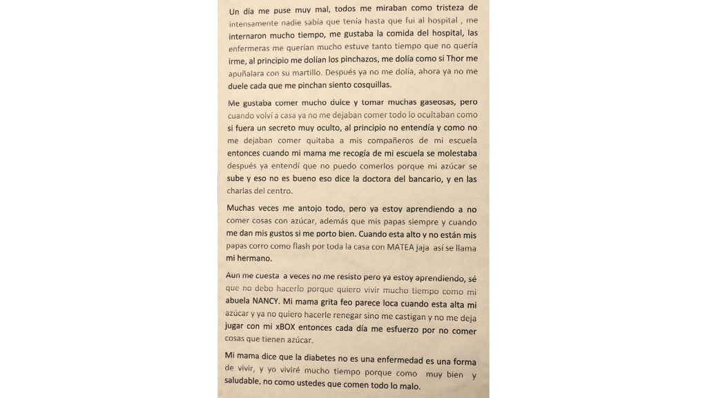 I liked to eat a lot of candy and drink a lot of sodas, but when I returned home, they no longer let me eat everything, they hid it as if it were a concealed secret. At first, I did not understand and since they would not let me eat, I would take things from my classmates from school so when my mother picked me up from school, she would get upset. Later I understood that I cannot eat them because my blood sugar rises and that is not good. That is what the doctor said, and what they said in the conferences at the center.