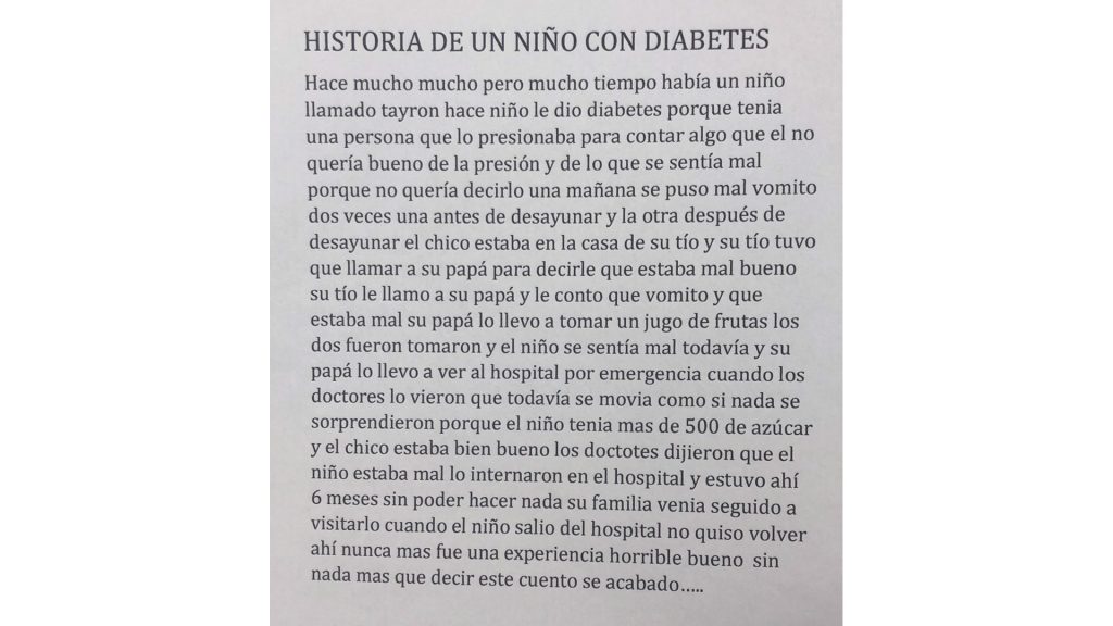 A long, long time ago there was a boy named Tayron, a boy who got diabetes because he had a person who pressured him to say something that he did not want to. Because of the pressure and because he felt bad for not wanting to say it, one morning he got sick and vomited twice, once before breakfast and the other after breakfast. The boy was at his uncle’s house, and his uncle had to call his dad to tell him he was sick. Well, his uncle called his dad and told him that he vomited and that he was sick. His dad took him out for fruit juice. The boy still felt sick, and his dad took him to the hospital to the emergency room. When the doctors saw him moving like there was nothing wrong, they were surprised because the boy had a blood sugar level of over 500, and he looked fine. Well, the doctors said that the child was sick, they admitted him to the hospital, and he was there for 6 months without being able to do anything. His family came often to visit him. When the boy left the hospital, he did not want to go back there ever again. It was a horrible experience. Well. with nothing more to say, this story is over…