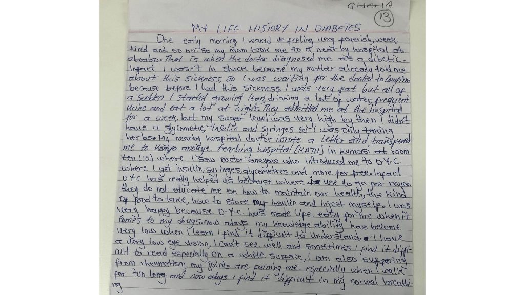 One early morning, I waked up feeling very feverish, weak, tired and so on. So my mom took me to a near by hospital at Aboabo. That is when the doctor diagnosed me as a diabetic. In fact I wasn’t in shock because my mother already told me about this sickness, so I was waiting for the doctor to confirm because before I had this sickness, I was very fat but all of a sudden I started growing lean, drinking a lot of water, frequent urine and eat a lot at night. They admitted me at the hospital for a week, but my sugar level was very high by then I didn’t have a glucometer, insulin and syringes so I was only taking herbs. My nearby hospital doctor wrote a letter and transferred me to Komfo Anokye teaching hospital (KATH) in Kumasi at room ten where I saw doctor Ameyaw who introduced me to DYC where I get insulin, syringes, glucometers and more for free. In fact DYC has really helped us because where I use to go for review they do not educate me on how to maintain our health, the kind of food to take, how to store my insulin and inject myself. I was very happy because DYC has made life easy for me when it comes to my drugs. Nowadays my knowledge ability has become very low when I learn I find it difficult to understand. I have a very low eye vision, I can’t see well and sometimes I find it difficult to read especially on a white surface, I am also suffering from rheumatism, my joints are paining me especially when I walk for too long. And nowadays I find it difficult in my normal breathing.