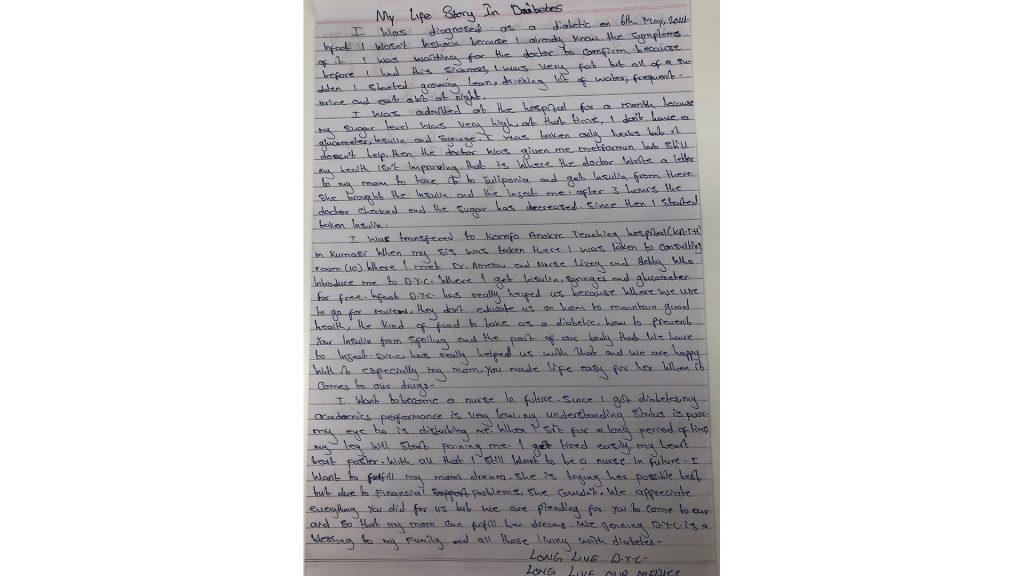 I was transferred to Komfo Anokye Teaching Hospital (KATH) in Kumasi, when my sis was taken there. I was taken to consulting room 10 where I met Dr. Ameyaw and nurse Lizzy and Debby who introduce me to DYC, where I get insulin, syringes and glucometer for free. Infact DYC has really helped us because where we use to go for review, they don’t educate us on how to maintain good health, the kind of food to take as a diabetic, how to prevent your insulin from spoiling and the part of our body that we have to inject. DYC has really helped us with tht and we are happy with it especially my mom. You made life easy for her when it comes to our drugs.