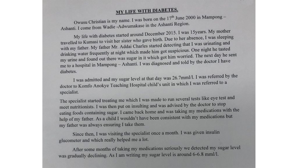 My life with diabetes started around December 2015. I was 15 years old. My mother travelled to Kumasi to visit her sister who gave birth. Due to her absence, I was sleeping with my father. My father Mr. Addai Charles started detecting that I was urinating and drinking water frequently at night which made him suspicious. One night he tasted my urine and found out there was sugar in it which got him worried. The next day he sent me to a hospital in Mampong – Ashanti. I was diagnosed and told by the doctor I have diabetes.