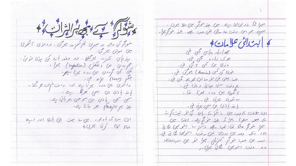 This happened in January 2017. I was a student in 8th class. Life was very easy. It was snowy weather and one night I had to go to the bathroom often. My parents noted that I was doing this. In the morning they took me to Ayub Hospital for a check up. My mom is very knowledgeable. She had sugar testing done. When they saw the reports they were quite worried. After morning breakfast my urine and blood were tested. My sugar was 743 and my blood pressure was also high. My parents admitted me to the hospital according to the doctor instructions. My doctor started IVs and insulin on me. In those 16 days I understood that my life was about to change dramatically.
